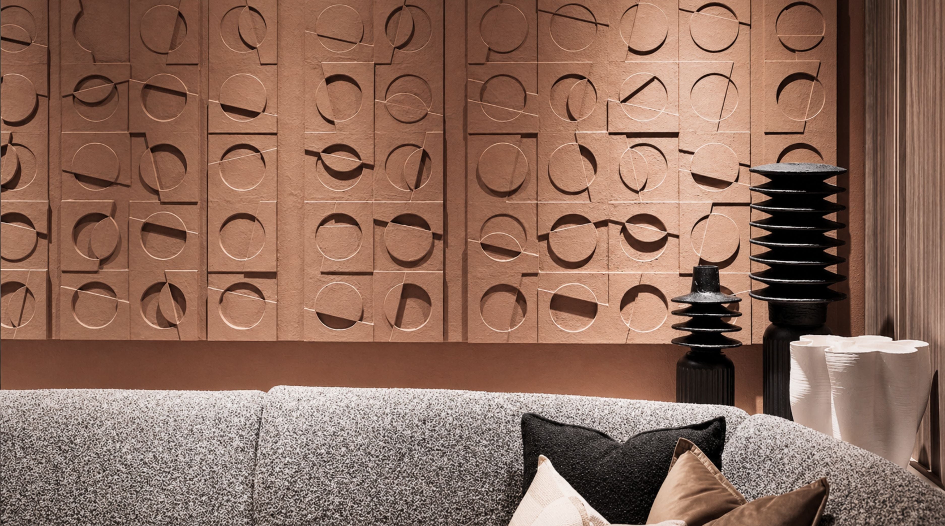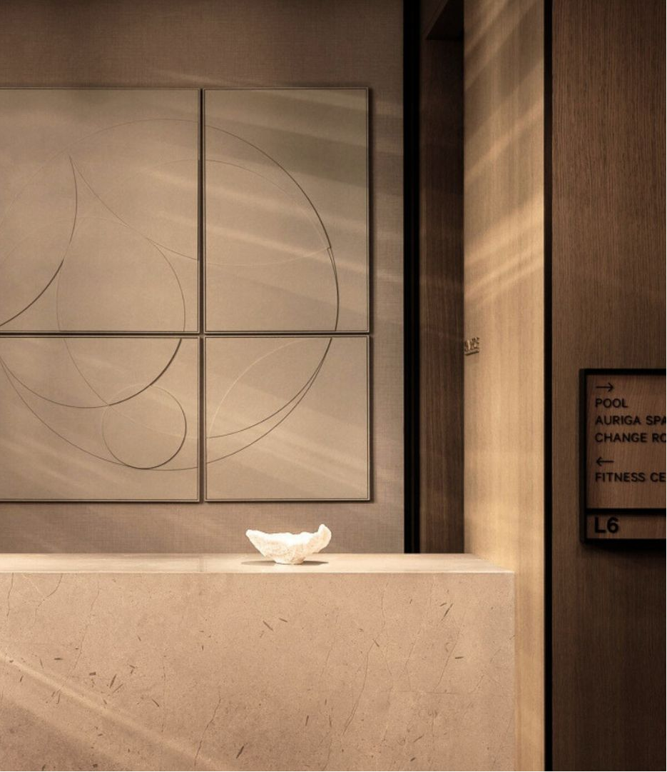 A continuous textural system anchoring the lobby environment